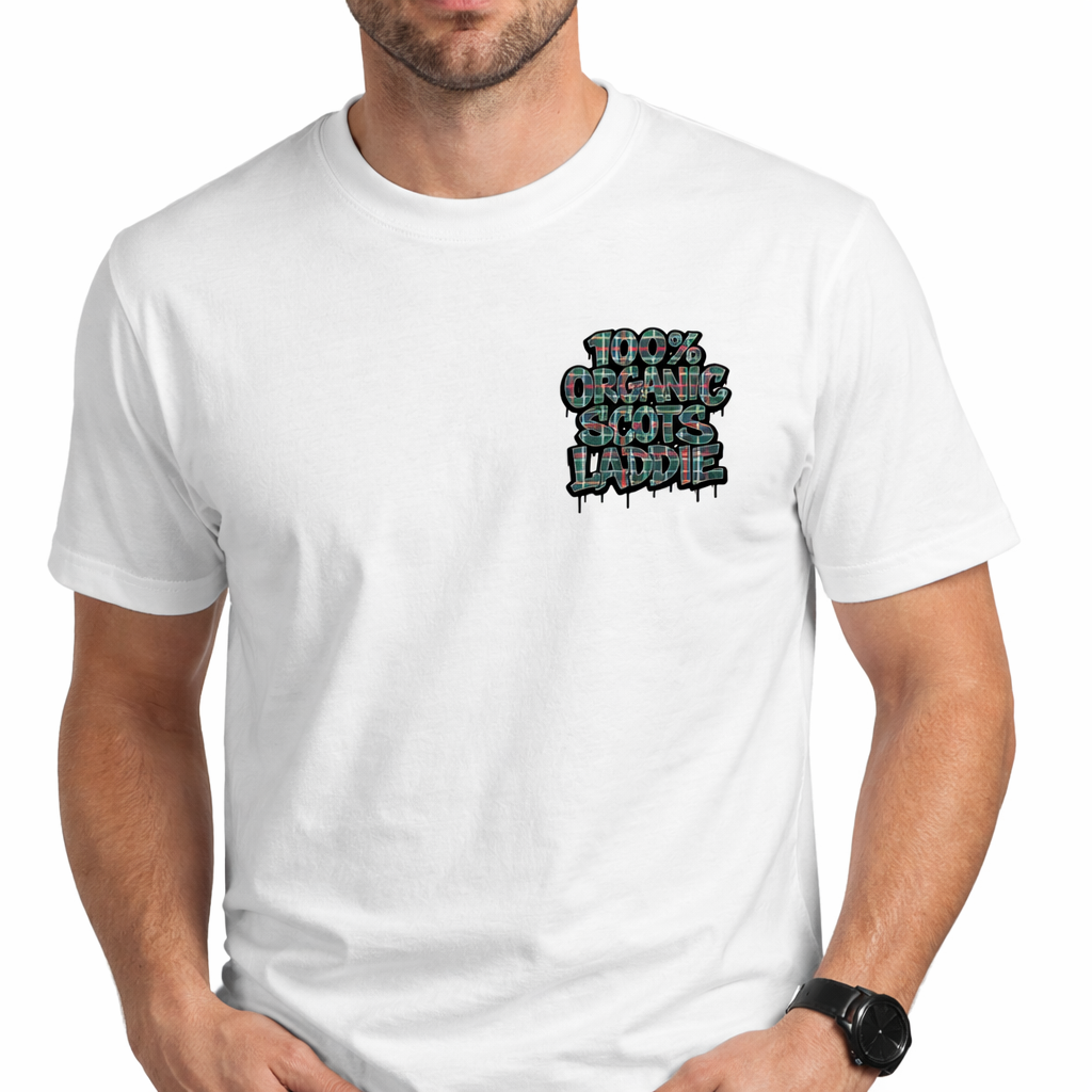 For the Scot who knows that quality and character go hand-in-hand. This isn’t just a t-shirt; it’s a statement of identity. Featuring a bold, graffiti-inspired “100% Organic Scots Laddie” graphic with a deep-etched tartan texture, this tee is designed for those who carry their heritage with a modern, “gallus” edge.